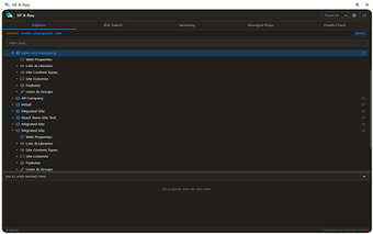 La herramienta ofrece un explorador de taxonomía para navegar por la jerarquía del almacén de términos y permite inspeccionar propiedades gestionadas dentro del esquema de búsqueda de SharePoint. Con características adicionales como un modo oscuro/claro, temas personalizables y un panel de propiedades, SP X-Ray proporciona un acceso intuitivo y directo a los recursos de SharePoint, todo manteniendo la privacidad del usuario al procesar la información de manera local.